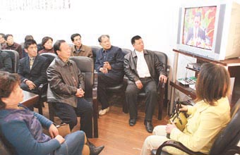 中国共产党衢州市第五次代表大会开幕,图为坊门街社区党员干部和群众收看现场直播。