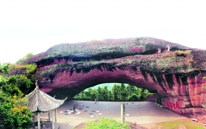 眼前是幽绿深远的大山,耳畔是铮铮淌过的溪水,远处是模糊的群岚。一座石亭掩映在半山间,为明代万历四十五年所建,名为“日迟亭”。驻足山下远远望去,即见山颠一条石粱悬空而架,犹如玉虹卧波,为浙江最大的天生桥,也是我国东南丹霞地貌第一天生石梁。石梁下有一大洞,开阔平坦的洞内,高10余米,宽100米,南北深约20米,这里有世上最大的围棋棋盘,四周的浓绿与黑白棋子相映,极富色彩美。这里也是传说中王质遇仙之处,称“青霞洞天”。从洞底仰望,可见山外青天如线,故也称“一线天”,东边石壁上刻有“天生石梁”四个大字,气势不凡,为明郡守李遂书,笔力遒劲,气度不凡。