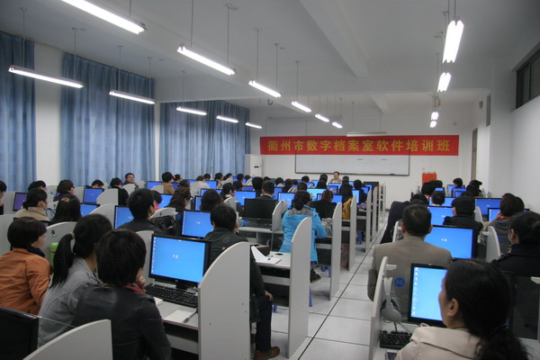 2012年11月8日,衢州市档案局举办了数字档案室软件培训班,来自八十多家市直单位的档案管理人员参加了培训。2012年下半年,衢州市档案局为加强和规范市直各单位数字档案室建设,加快市直各单位档案信息化进程,推动全市档案事业可持续发展,市档案局针对衢州实情,与软件公司共同研制开发了一套数字档案室软件,并面向市直各单位免费推广使用。为了让各单位档案管理人员尽快掌握数字档案室软件操作能力,衢州市档案局在衢州学院计算机中心机房举办了培训班。培训采用现场演示讲解并实际上机操作的方式,衢州市档案局信息技术处的何志华、江潇分别就数字档案室软件的操作及档案登记备份打包软件进行了讲解,讲解完毕以后,采取每个单位一台计算机的方式现场上机操作,发现问题及时解决。这种教、学和操作相结合的方式,深受培训人员的欢迎,达到了当场教、当场会的效果,绝大部分档案管理人员回去后都能自行安装、自行使用,加大了数字档案室软件的推广力度。上图为培训现场。