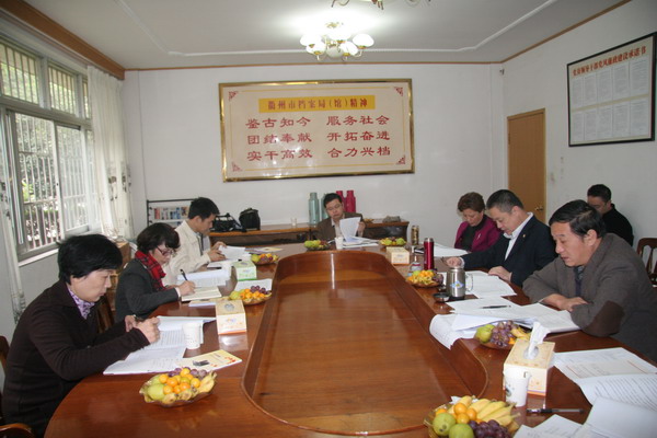 2011年11月15日,浙江省档案局登记备份管理处许春芝处长率检查组来衢考核指导档案登记备份工作,检查组一行在听取了衢州市档案局的汇报后,实地查看了衢州市档案登记备份中心,并就衢州市档案登记备份工作提出了指导性意见。上图为检查组听取衢州市汇报。