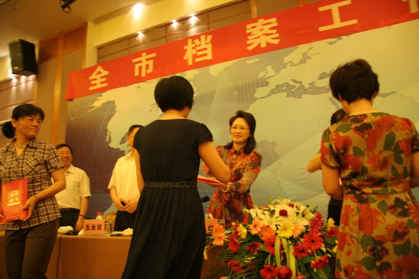 大会主席台(从左至右依次为:市档案局副局长:陈忠涛、市档案局局长:张爱国、副市长:罗卫红、市政府副秘书长:郑小瑛、市档案局副局长:程军、市档案局纪检组长:聂益武)