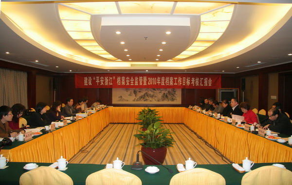 2011年1月5日上午,以省档案局副局长丁越飞带队的考核组一行,对衢州市开展建设“平安浙江”档案安全监管暨2010年度档案工作目标进行考核。考核组听取了衢州市档案局张爱国局长的汇报,并实地查看了衢州市档案局登记备份中心、查阅大厅和设备机房。在翻阅了台帐和实地检查之后,省档案局业务指导处处长许春芝就考核情况作了简单反馈,最后丁越飞副局长对考核情况进行了总结,他充分肯定了衢州市档案局开展建设“平安浙江”档案安全监管工作和完成2010年度档案工作目标任务所取得的成绩,并就未来的发展,特别是“十二五”期间的发展,提出了宝贵意见。上图为考核会现场。