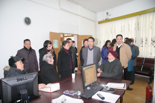 省考核组在查阅大厅与查阅档案的老同志亲切交谈