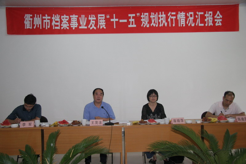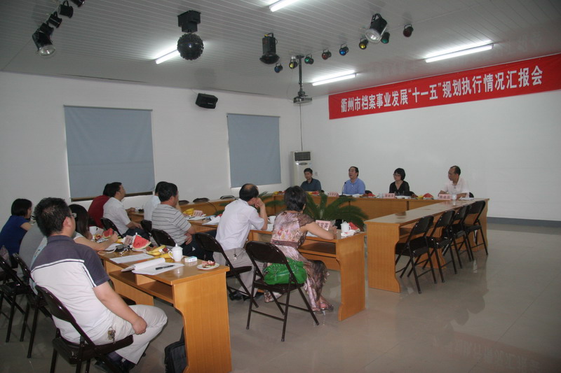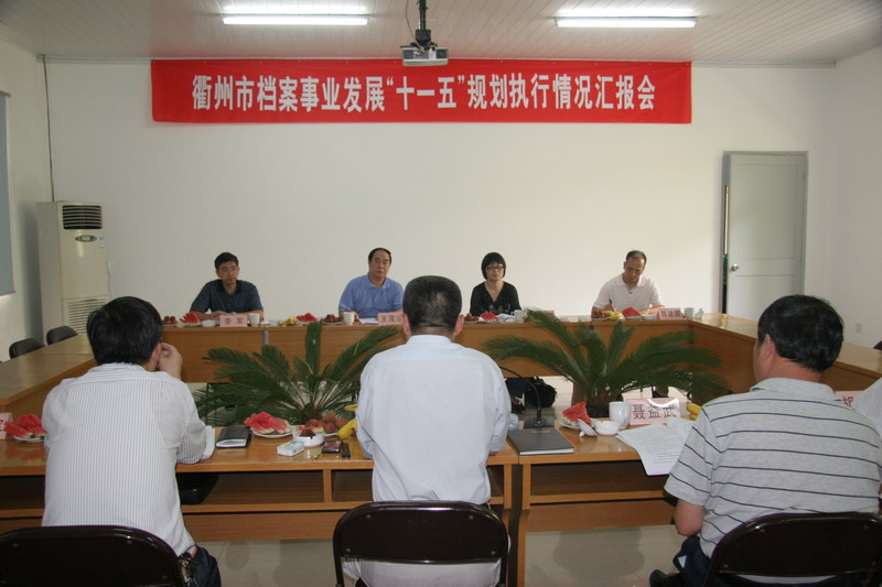 2010年7月22日,以浙江省档案局副局长王茂法为组长的浙江省档案事业发展“十一五”规划执行情况评估组到衢州进行实地调研,衢州市档案局局长张爱国向评估组汇报了衢州市档案事业发展“十一五”规划执行情况,并就浙江省档案事业发展“十二五”规划编制提出了建议。王茂法副局长充分肯定了衢州市档案局“十一五”期间的工作成绩,并对衢州“十二五”期间档案工作的发展方向提出了指导性意见。上图为会议现场。