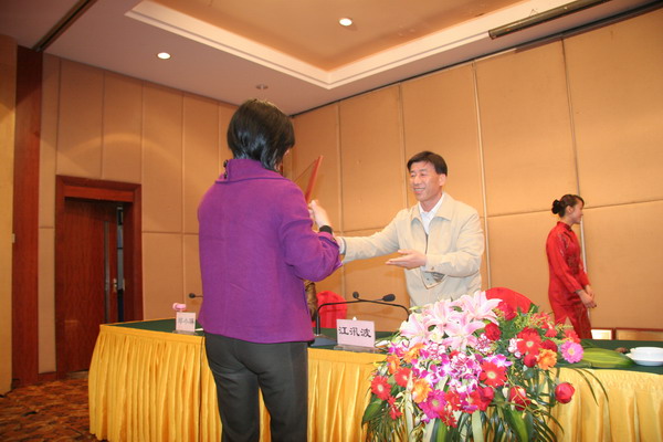 市委常委、秘书长江汛波向常山县颁发“新农村建设档案工作示范县”