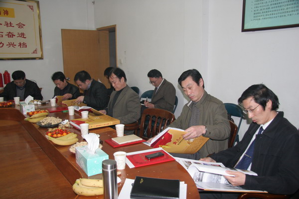 著名摄影家柳锡松(右一)、董克(右二)等欣赏衢州市档案局捐赠的