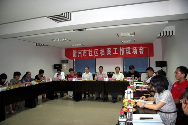 2009年9月25日,衢州市社区档案工作现场会在柯城区府山街道蛟池街社区召开,衢州市档案局局长张爱国,副局长程军、陈忠涛,纪检组长聂益武、柯城区委副书记吕跃龙及各县(市、区)档案局领导、业务科长、社区代表参加了会议。会上,柯城区委副书记吕跃龙介绍了柯城区社区档案工作建设情况,柯城区档案局就全区社区档案工作情况作了汇报,蛟池街社区作了典型发言。在参观了蛟池街社区档案工作现场以后,与会的各县(市、区)代表作了表态发言。最后,市档案局张爱国局长对衢州市社区档案工作作了总结和工作部署。上图为会议现场。