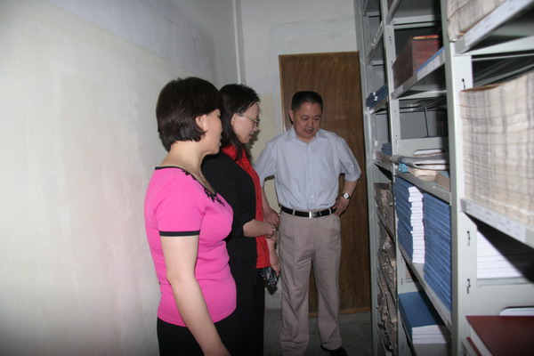 上图为罗卫红副市长(左一)在市档案局局长张爱国(右一)陪同下参观市档案局库房