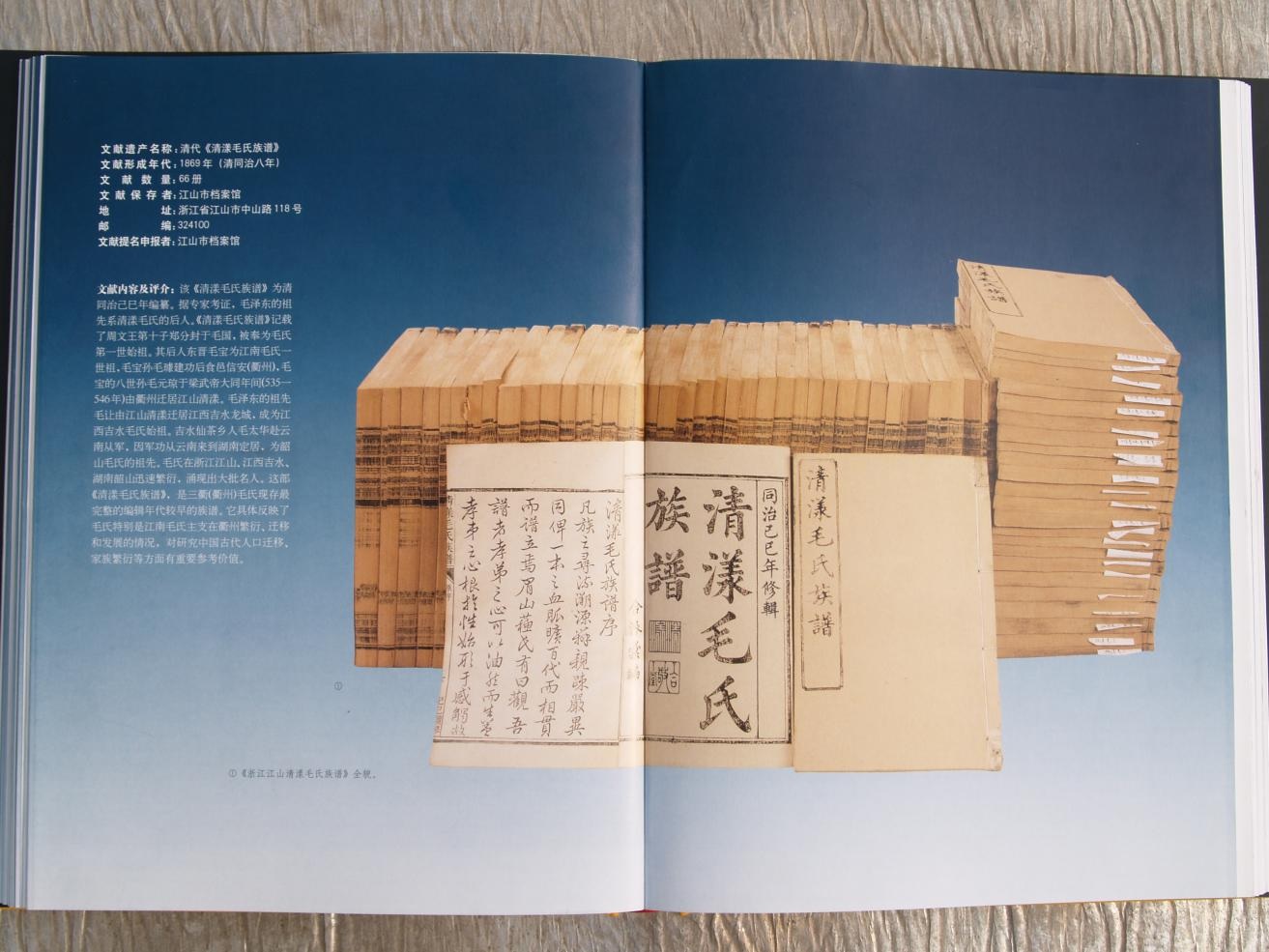 由江山市档案馆选送的《清漾毛氏族谱》系清同治八年(1869)所修,为江山清漾毛氏第27世后裔、宋龙图阁待制毛渐始纂。早在2002年3月,《清漾毛氏族谱》就被中国国家档案局、中央档案馆公布为首批“中国档案文献遗产名录”。这是当时唯一一部由民间修纂的私家谱牒。当然,这部谱牒还揭示了一个重要的史实:毛泽东祖居地——清漾。