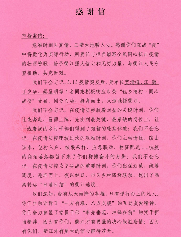 3月25日,衢江区委、区政府向市档案馆送来感谢信,对市档案馆在3.13疫情防控关键阶段派出党员先锋队火速驰援衢江,共同奋战,夺取疫情防控攻坚战胜利表示崇高的敬意和衷心的感谢