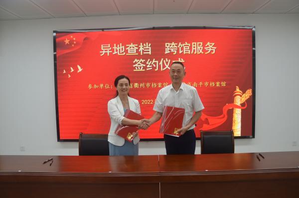 在南平市档案馆,双方就新馆建设、民生档案查阅利用、档案基础业务建设和展览展陈等工作进行了深入探讨与交流。蓝水高馆长和黄萍馆长分别代表衢州市档案馆和南平市档案馆签订《“异地查档、跨馆服务”工作协议》。
