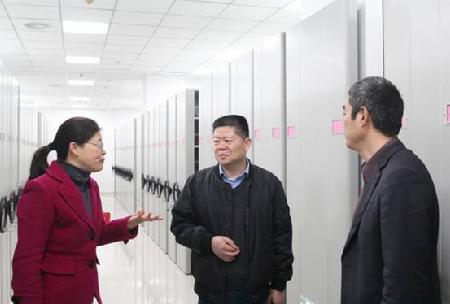省档案局副局长胡元潮(中)在市档案局副局长王励(左一)陪同下参观档案馆新库房