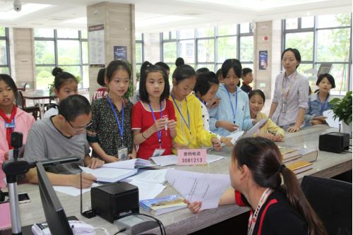 巾帼文明岗岗员在查阅大厅向衢江区安仁小学学生介绍档案查阅流程