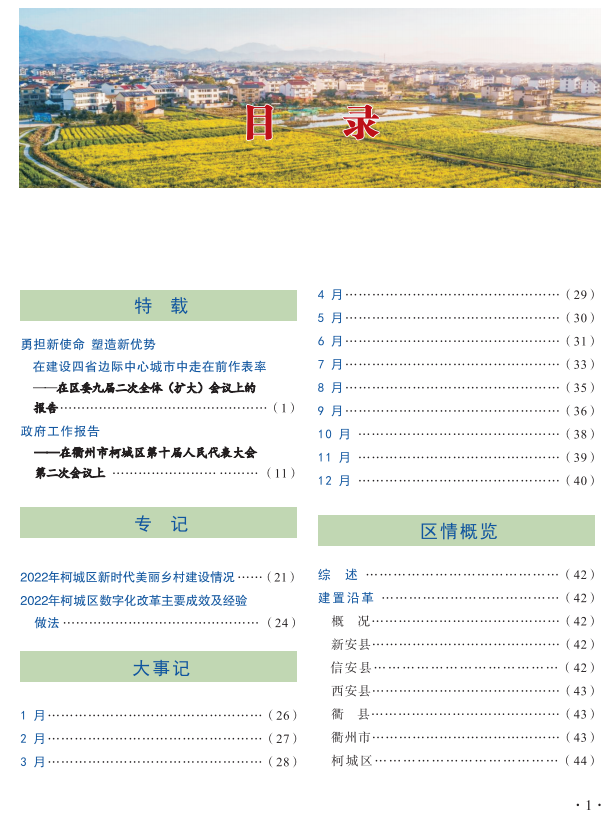 三、本年鉴框架由卷首、百科、卷尾三部分组成,卷首、卷尾采用综合体,百科采用条目体。设类目、分目、条目三个层次,条目为主要信息载体。卷首设各单位审稿人名单、彩页、地图、目录、特载、专记、大事记、区情概览。卷尾设附录,录入2022年柯城区国民经济和社会发展统计公报,柯城区机构单位及负责人名录,区委、区政府部分文件选目,荣誉录等资料。