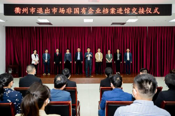 5月20日,衢州市档案馆联合衢州市中级人民法院举办退出市场非国有企业档案进馆交接仪式。省档案局副局长张军一行,省高院民五庭副庭长王雄飞,市委副秘书长、市档案局局长、市档案馆馆长蓝水高,市中院党组成员、副院长祝菊红等出席活动。市委办副主任姜芳主持仪式。省档案局副局长张军、市中院党组成员、副院长祝菊红分别致辞。随后召开退出市场非国有企业档案处置座谈会。市档案局、市档案馆、市中院相关处室负责人及市破产管理人协会、衢州青年传动系统制造有限公司管理人代表等参加活动。