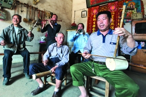沈樟树倪(右一)和十番锣鼓队员在一起。 廖峥艳 摄
