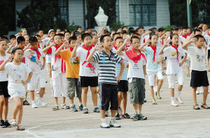 9月17日早上,我们在衢州市柯城区尼山小学操场上看到学生正在边朗诵边做《弟子规操》。这是该校老师根据儒家办学特色自编的,《弟子规操》分上、下两部分,每部分4分多钟,共计9分多钟。每天在“大课间”时段做,学生边朗诵《弟子规》,边做《弟子规操》,融经典学习、道德教育、锻炼身体为一体。