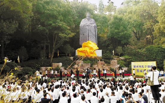 9月28日,一座孔子青铜巨像在衢州孔文化公园内揭幕,铜像高9米,以孔子站姿为造型,长髯垂胸、衣袂飘飘,充分体现孔子慈善、仁爱 9月28日,一座孔子青铜巨像在衢州孔文化公园内揭幕,铜像高9米,以孔子站姿为造型,长髯垂胸、衣袂飘飘,充分体现孔子慈善、仁爱的万世师表气质。 储永志摄