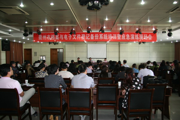 2012年9月25日,衢州市召开档案与电子文件登记备份系统培训暨应急演练现场会,来自市直机关各单位的档案人员及13家重点涉民单位的信息技术负责人参加了会议,衢州市档案局副局长陈忠涛到会并就进一步开展档案登记备份工作进行动员讲话,陈忠涛副局长肯定了前期衢州市档案登记备份工作取得的成绩及各单位档案人员所付出的努力,也指出了我市档案登记备份工作与发达地市之间的差距,并分析了其中的原因,最后就如何做好今后的档案登记备份工作,特别是如何圆满完成今年省、市档案登记备份工作的考核任务,陈忠涛副局长提了几点希望和要求。衢州市档案局信息技术处副处长何志华为与会人员解读了档案登记备份相关文件精神,并对档案登记备份工作流程进行了讲解。参与开发档案登记备份系统的上海中信公司技术人员也为与会人员开展了系统培训。培训会后,13家重点涉民单位的档案人员与信息技术人员来到衢州市人力资源和社会保障局,参观了该局信息中心机房及12333咨询中心,在听取了信息中心负责人关于衢州市人力资源和社会保障局与档案局开展档案登记备份工作的汇报后,现场30余位人员现场观摩了衢州市人力资源和社会保障局如何将电子数据登记备份到市档案登记备份中心,市档案登记备份中心如何开展审核、反馈。现场会最后开展了应急演练,演练模拟市人力资源和社会保障局信息中心由于断电原因发生数据丢失情况,向市档案登记备份中心申请提取数据,经审核后市登记备份中心将原来备份在中心的数据在线传送给市人力资源和社会保障局信息中心,帮助恢复了数据,发挥了档案登记备份中心职能作用。演练达到了预期的效果,13家重点涉民单位纷纷表示回去后要尽快向领导汇报,及时开展档案登记备份工作,确保今年任务圆满完成。上图为档案登记备份系统培训会现场。