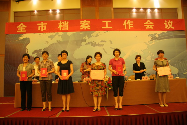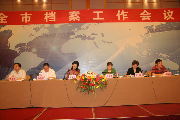 大会主席台(从左至右依次为:市档案局副局长:陈忠涛、市档案局局长:张爱国、副市长:罗卫红、市政府副秘书长:郑小瑛、市档案局副局长:程军、市档案局纪检组长:聂益武)