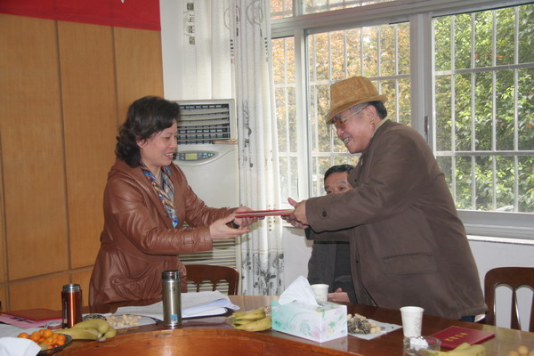 衢州市档案局副局长程军(左一)向“纪念衢州解放60周年档案史料有奖征集活动”二等奖获得者-林国镇(右一)颁奖