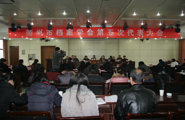 2009年12月15日上午,衢州市档案学会第五次代表大会在衢州老年大学6楼会议室召开,市委常委、市委秘书长江汛波在会上作了重要讲话,副市长罗卫红列席了会议,市社科联、市民间组织管理办公室的领导分别作了重要讲话,衢州市档案局张爱国局长、纪委书记聂益武分别主持会议,张爱国局长还代表第五届理事会讲话,提出新一届理事会工作目标任务和2010年学会工作安排,程军副局长宣读了第五届理事会理事候选人情况的说明,陈忠涛副局长宣读了市档案学会章程的修改说明。学会全体理事、团体会员代表单位、各县(市、区)档案部门负责人参加了会议。上图是大会全景图。