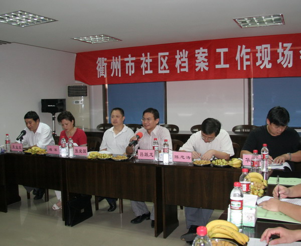 2009年9月25日,衢州市社区档案工作现场会在柯城区府山街道蛟池街社区召开,衢州市档案局局长张爱国,副局长程军、陈忠涛,纪检组长聂益武、柯城区委副书记吕跃龙及各县(市、区)档案局领导、业务科长、社区代表参加了会议。会上,柯城区委副书记吕跃龙介绍了柯城区社区档案工作建设情况,柯城区档案局就全区社区档案工作情况作了汇报,蛟池街社区作了典型发言。在参观了蛟池街社区档案工作现场以后,与会的各县(市、区)代表作了表态发言。最后,市档案局张爱国局长对衢州市社区档案工作作了总结和工作部署。上图为会议现场。