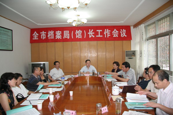 2009年8月18日,衢州市档案局召开了全市档案局(馆)长会议,市档案局中层以上领导干部及各县(市、区)局(馆)长参加了会议,会议总结了全市上半年档案工作,对下半年档案工作作出了部署。上图为会议场景。