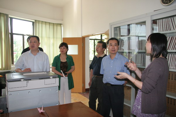 上图为督查组组长、省档案局副局长丁越飞(右二)在市档案局局长张爱国(左一)、副局长程军(左二)的陪同下,对档案查阅室进行检查。