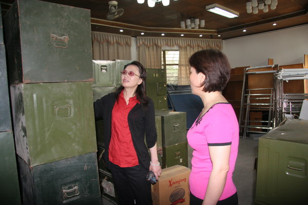 上图为罗卫红副市长(右一)在市档案局副局长程军(左一)陪同下参观市档案局临时库房
