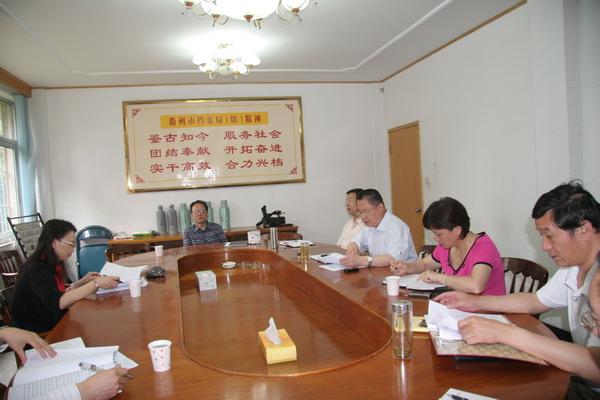 上图为罗卫红副市长(左一)在听取市档案局局长张爱国(右三)汇报衢州市档案局建设发展情况,副局长程军(右二)、陈忠涛(右四)及纪检组长聂益武(右一)在座。