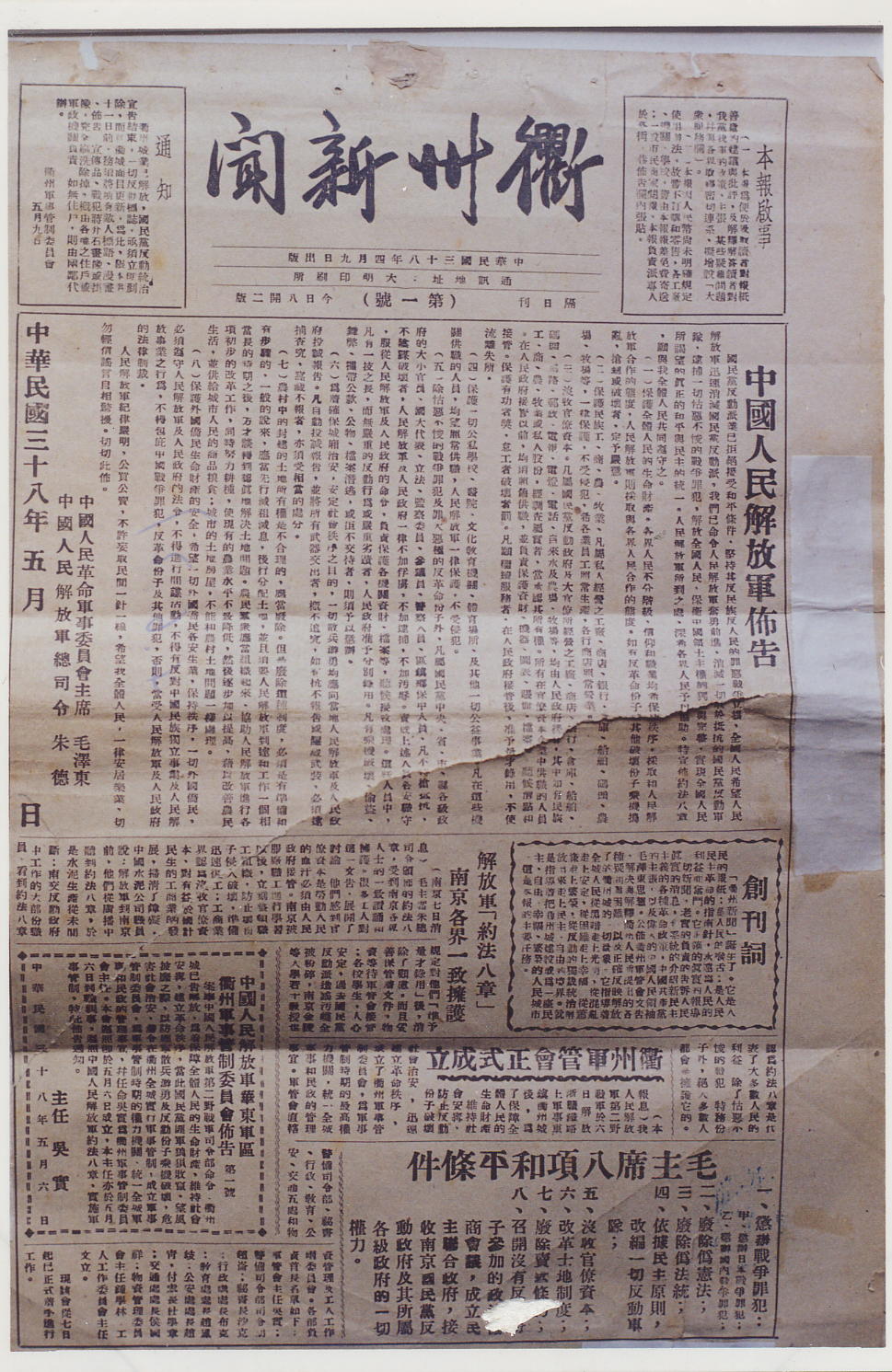 由市档案馆选送的《衢州新闻》在衢州报业历史上占重要地位,也是如今《衢州日报》的雏形。1949年5月6日,衢州解放。中国人民解放军衢州军事管制委员会接管了大明印刷所,出版《衢州新闻》。报纸八开二版,隔日刊,每期2000份。主要传播解放军胜利捷报和解放区的政令政策。其中《衢州新闻》第一期刊登了《衢州军管会正式成立》的消息和《中国人民解放军华东区衢州军事管制委员会布告第一号》。同年5月23日,因军管部队撤离而停刊,共出8期。