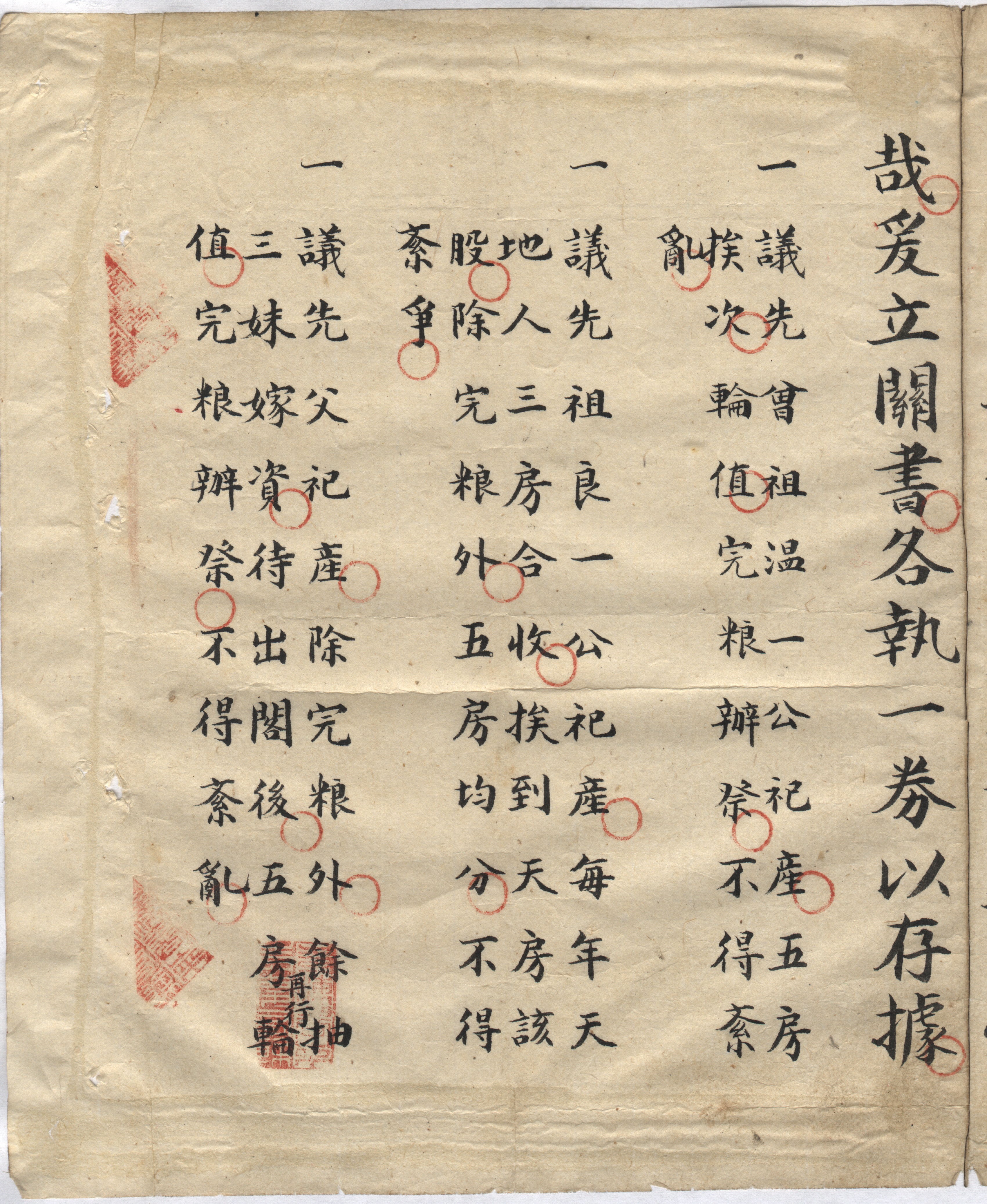 由常山县档案馆选送的清代关书,系常山罗家五兄妹于光绪十八年(1892)所立。由于该家族分派较多,遂将先父遗留下的田地财产进行分配,各房立关书各执一卷以存为据。这套20页的关书内容全面,家里人物述说明细,承载财产信息完整,且印鉴完备,对研究晚清的经济、社会发展提供了一份不可多得的珍贵史料。