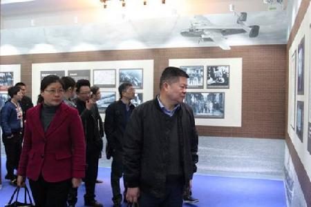 省档案局副局长胡元潮(右一)在市档案局副局长王励(左一)陪同下参观浙江军民营救美军飞行员档案展览