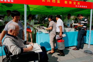 早上八点多钟,离活动正式开幕还有一个多小时,档案馆工作人员刚把活动赠送的首批资料及书籍摆上展台,宣传折页和《锦绣长兴2012》、《长兴事务通》等书籍资料就被围上来的人们索取一空,其中许多人还拉着长兴档案局(馆)长张满山要求签名留念。一时间,“签名送书”成了活动现场的一景。