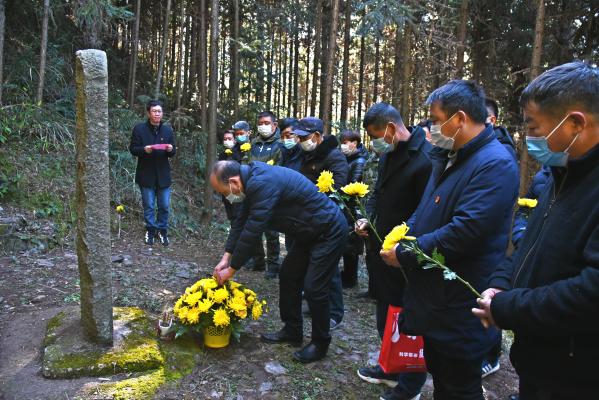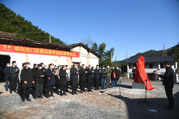 随后,蓝水高与胡炳泉共同为中共石门区委仙居寺旧址纪念碑揭牌,全体党员干部在纪念碑前重温入党誓词。揭牌仪式后,袁风华带领部分与会人员祭扫了毛绍信烈士墓并向烈士敬献花篮。