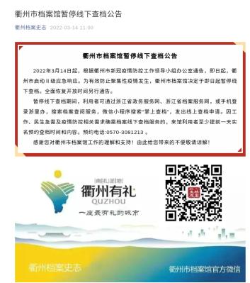 通过衢州微信公众号向社会公告,以线上服务为主,利用者可通过浙江省政务服务网、浙江省档案服务网,或手机登录浙里办,搜索档案查阅服务,微信小程序搜索“掌上查档”,发出线上查档申请。因工作、民生急需及疫情防控相关需求确需档案线下查档服务的,来馆利用者至少提前一天实名预约查档时间和内容。预约电话:0570-3081213 。